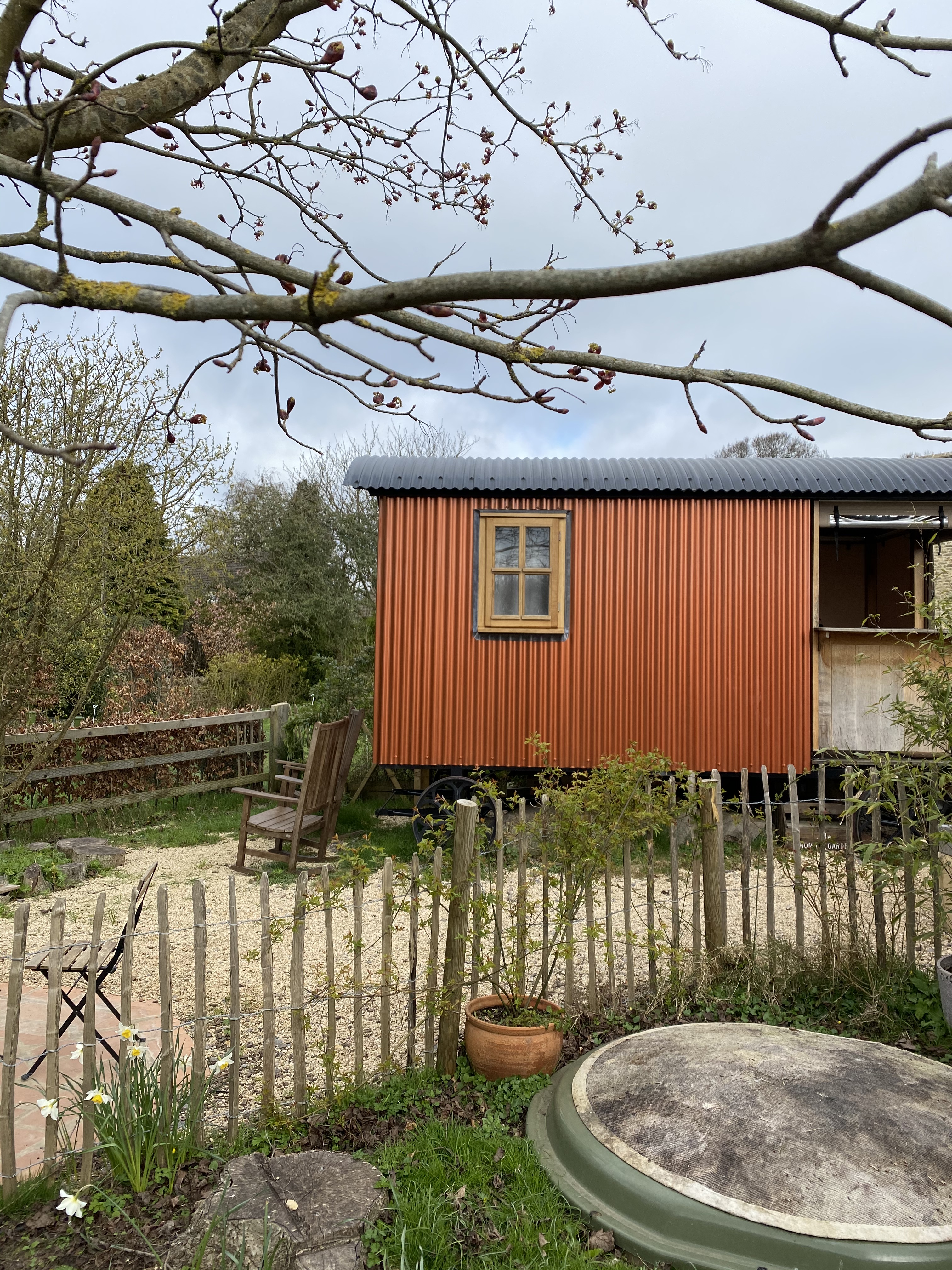 The trail goes through woods (The Daneway Banks Nature Reserve and Siccaridge Woods), which are gorgeous, it also crosses wide valleys offering far away vistas, and the delightful Cotswold village of Oakridge Lynch, where I totally fell in love with a bronze shepherd’s hut. I mean… look at it!