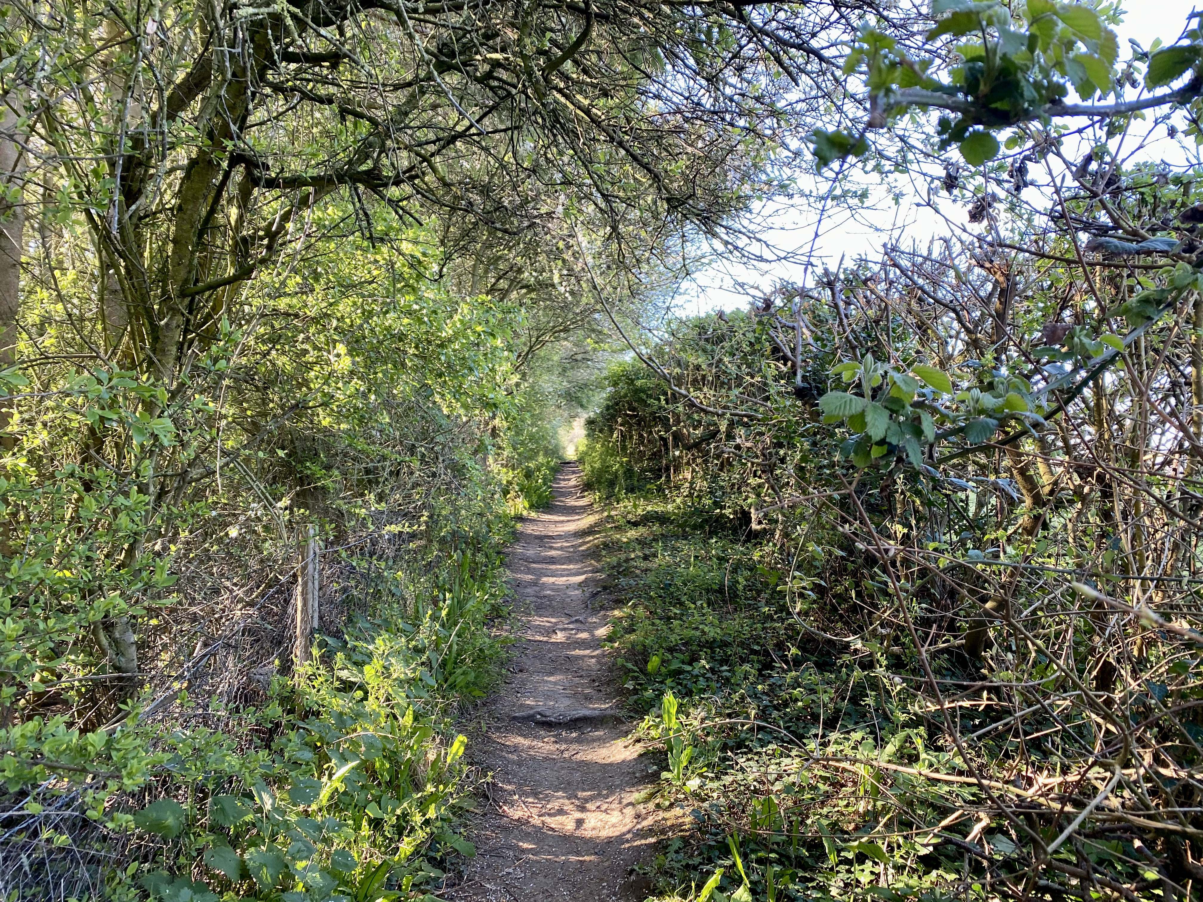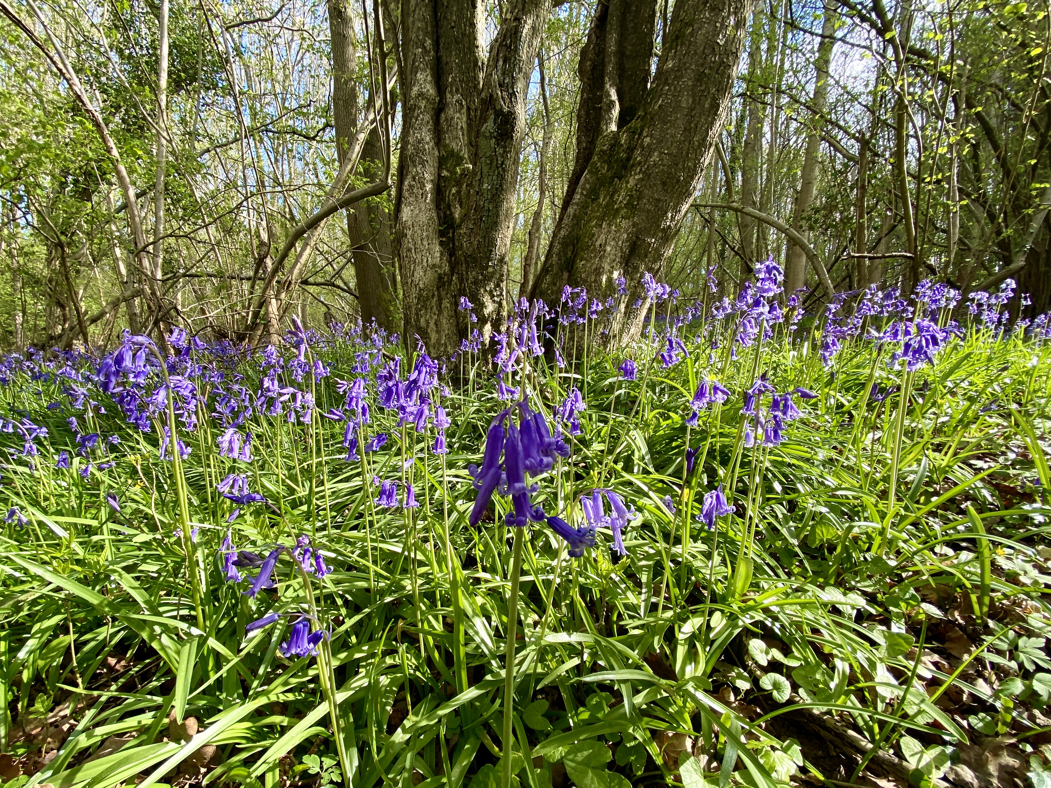 The path descends right and after crossing a few sloping fields, it runs along the Abbey’s woods (on your right). It’s bluebells season and and they were glorious.