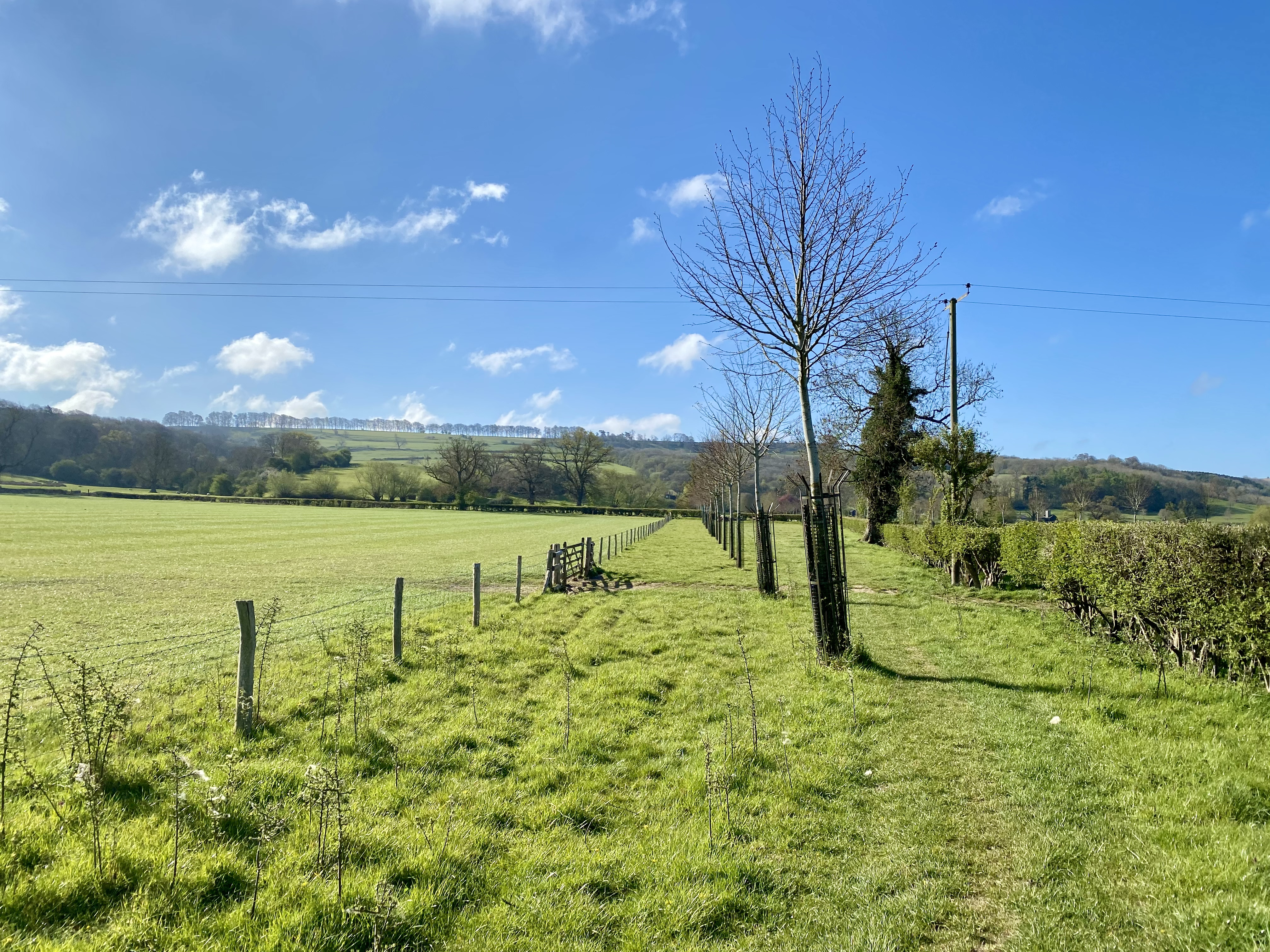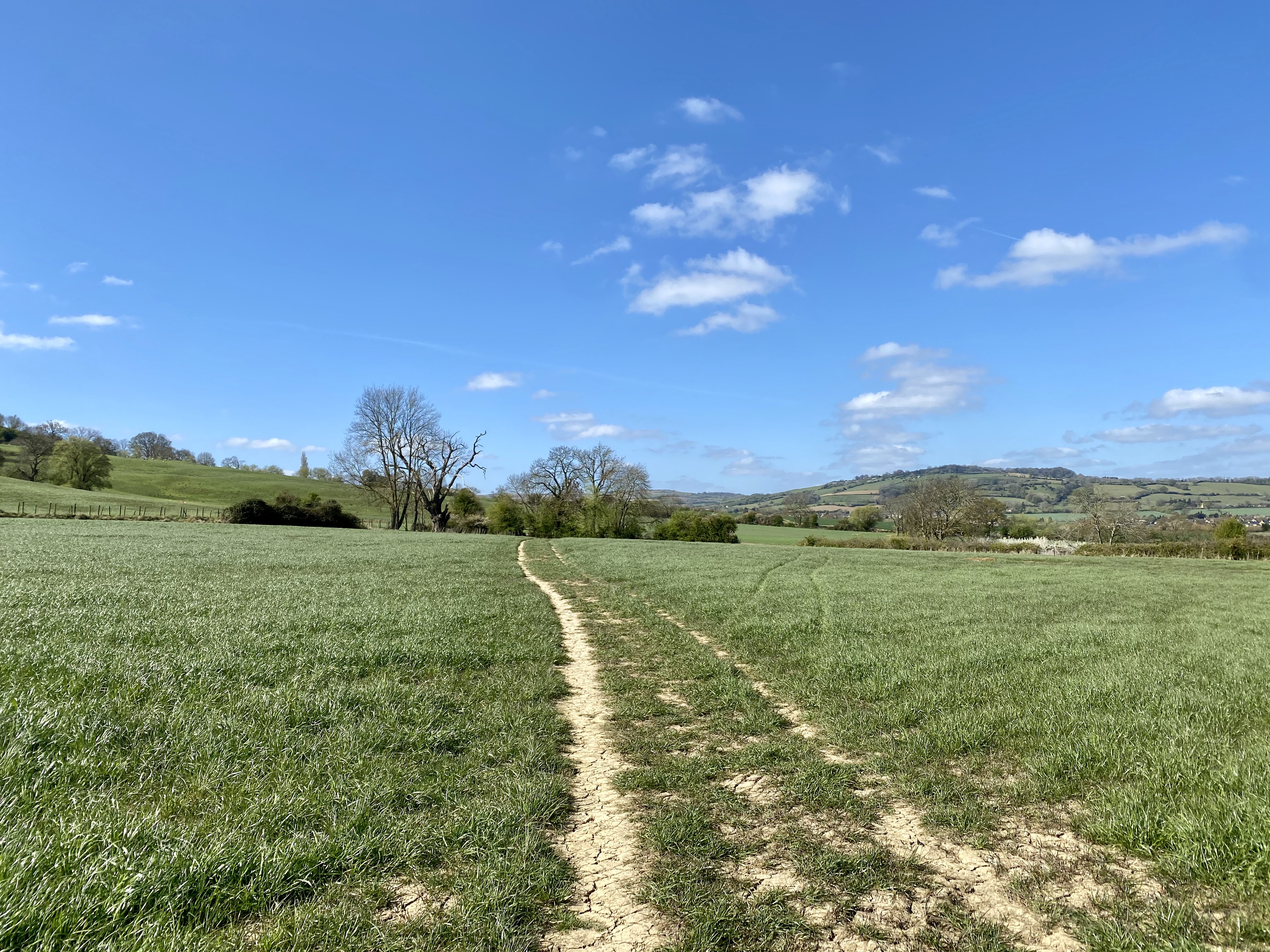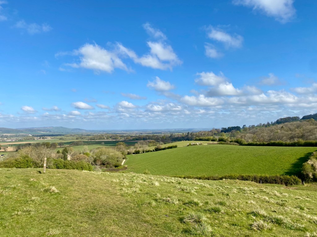 You’re out in the valley again and in front of you on the other side of rolling fields with cows and sheep grazing is the tallest point of the Cotswold, Cleeve Common.
