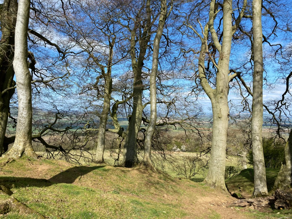 At the top of the Cotswold escarpment, you can just about see the remaining signs of Beckbury Camp an Iron Age hill for on your left (1000/2000 BC). ( Find a really good aerial photo here.), while at the bottom right hand corner stands a group of beeches called Cromwell Clump, so called because it is said that Thomas Cromwell stood here watching the dismantling of Hailes Abbey in the valley below. There’s also a strange stone monument/column… – you can’t miss it – of which nothing is known… very mysterious…