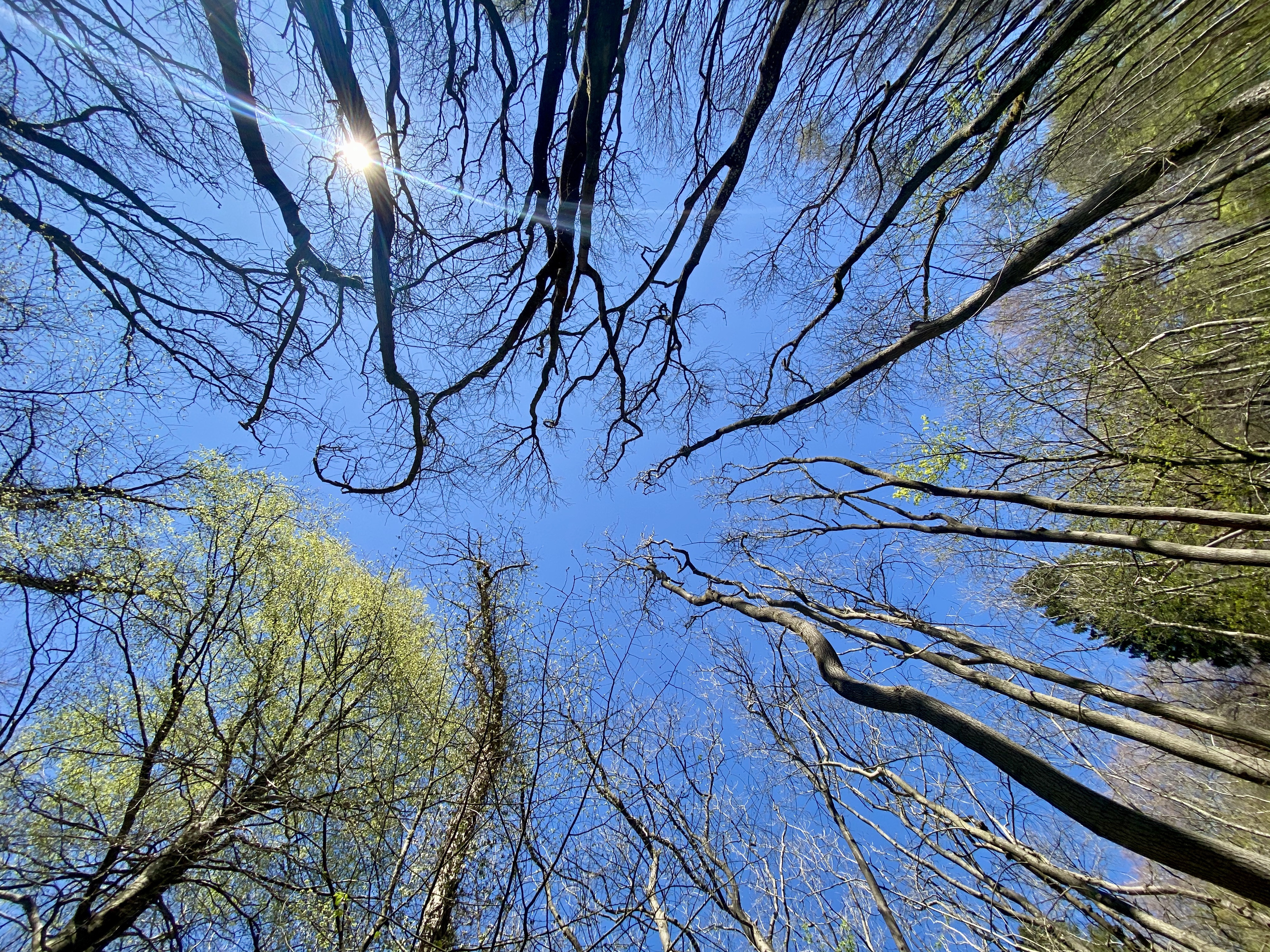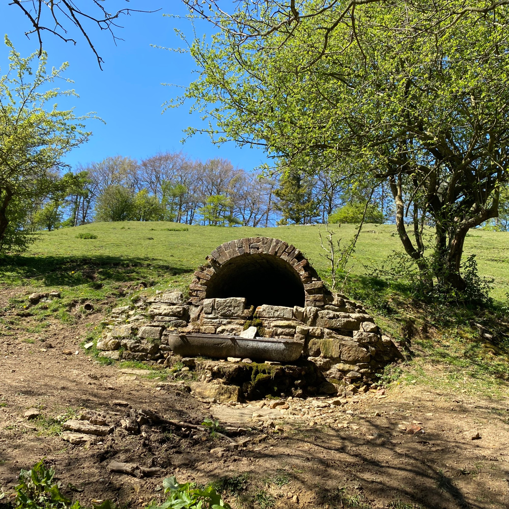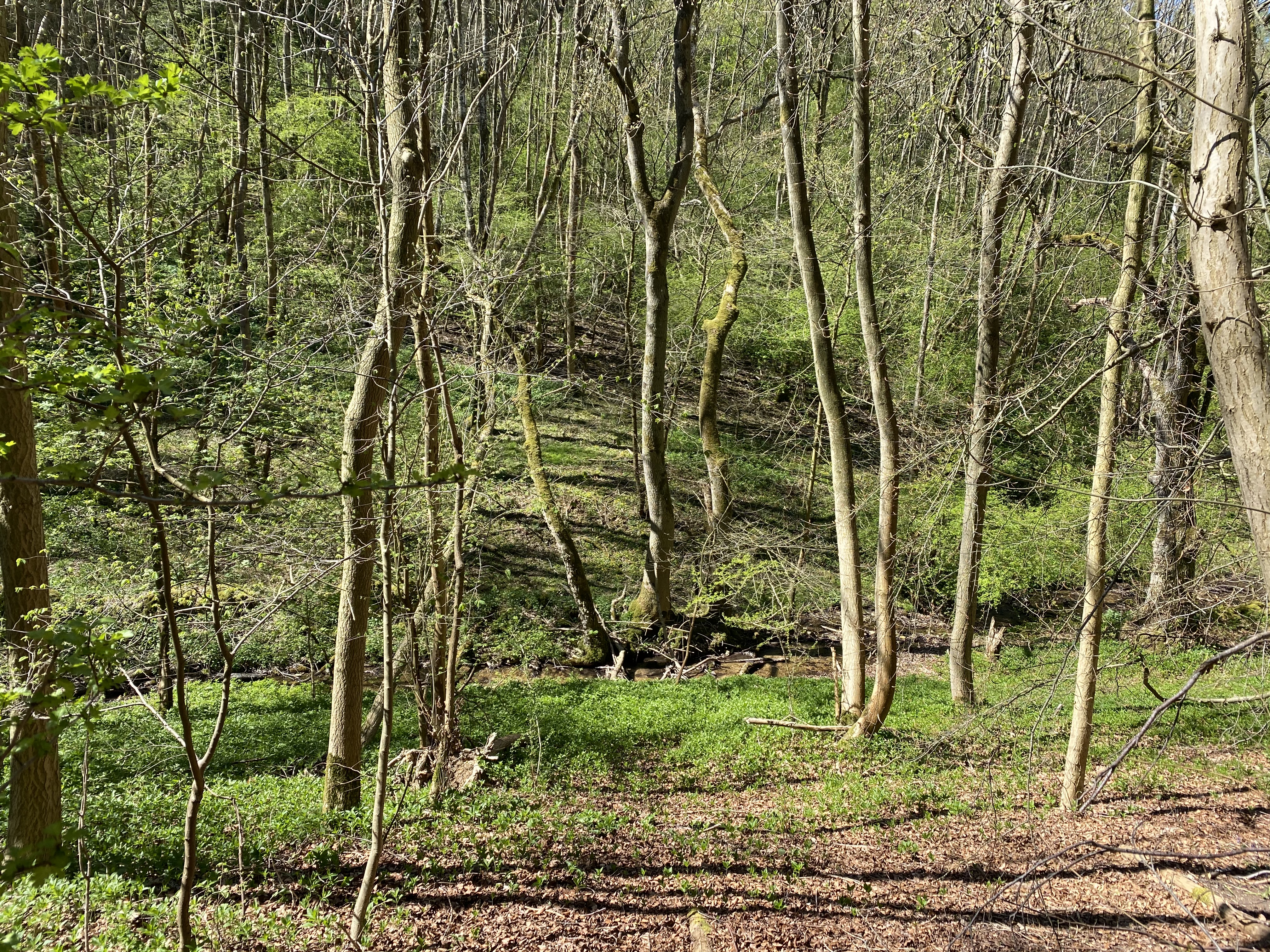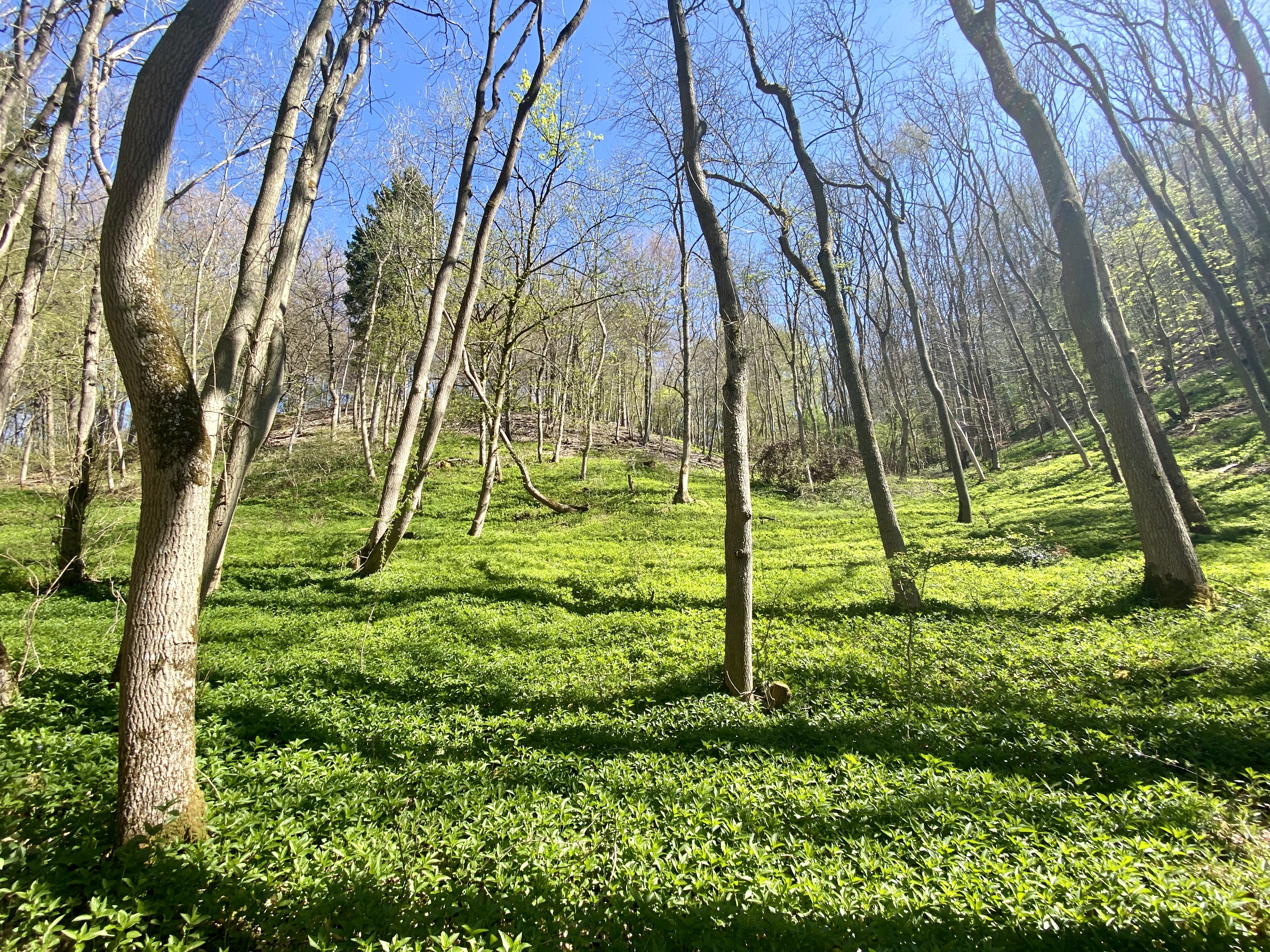 Cross a few fields and then begin a very sharp descent through beautiful woodland with a gently bubbling brook on your left…