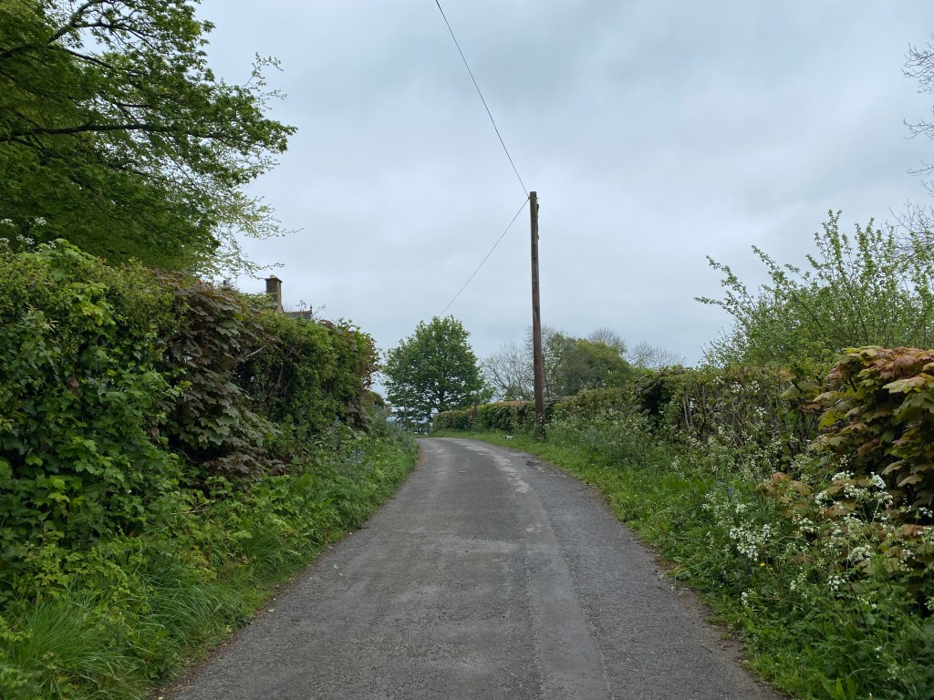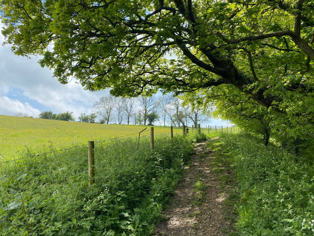 Opposite the lichgate the path continues uphill, through houses and then wide open fields…