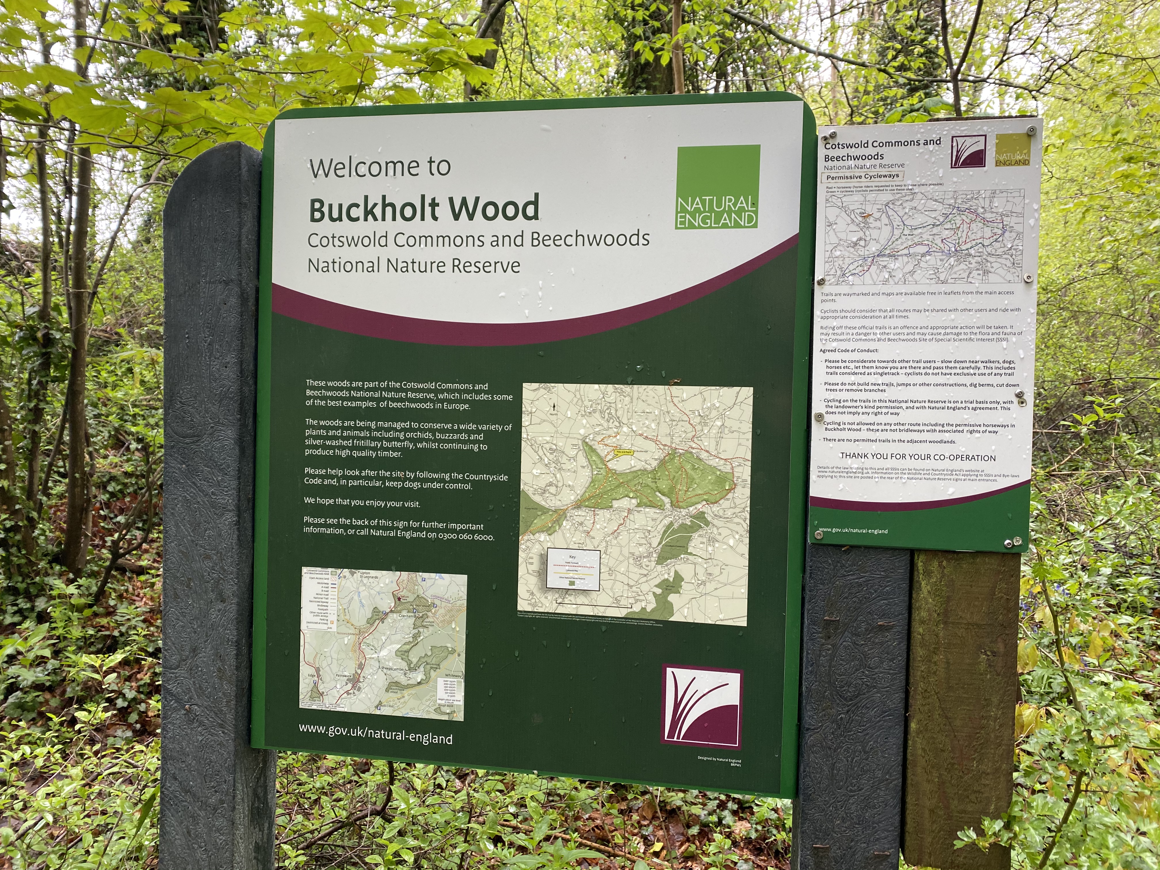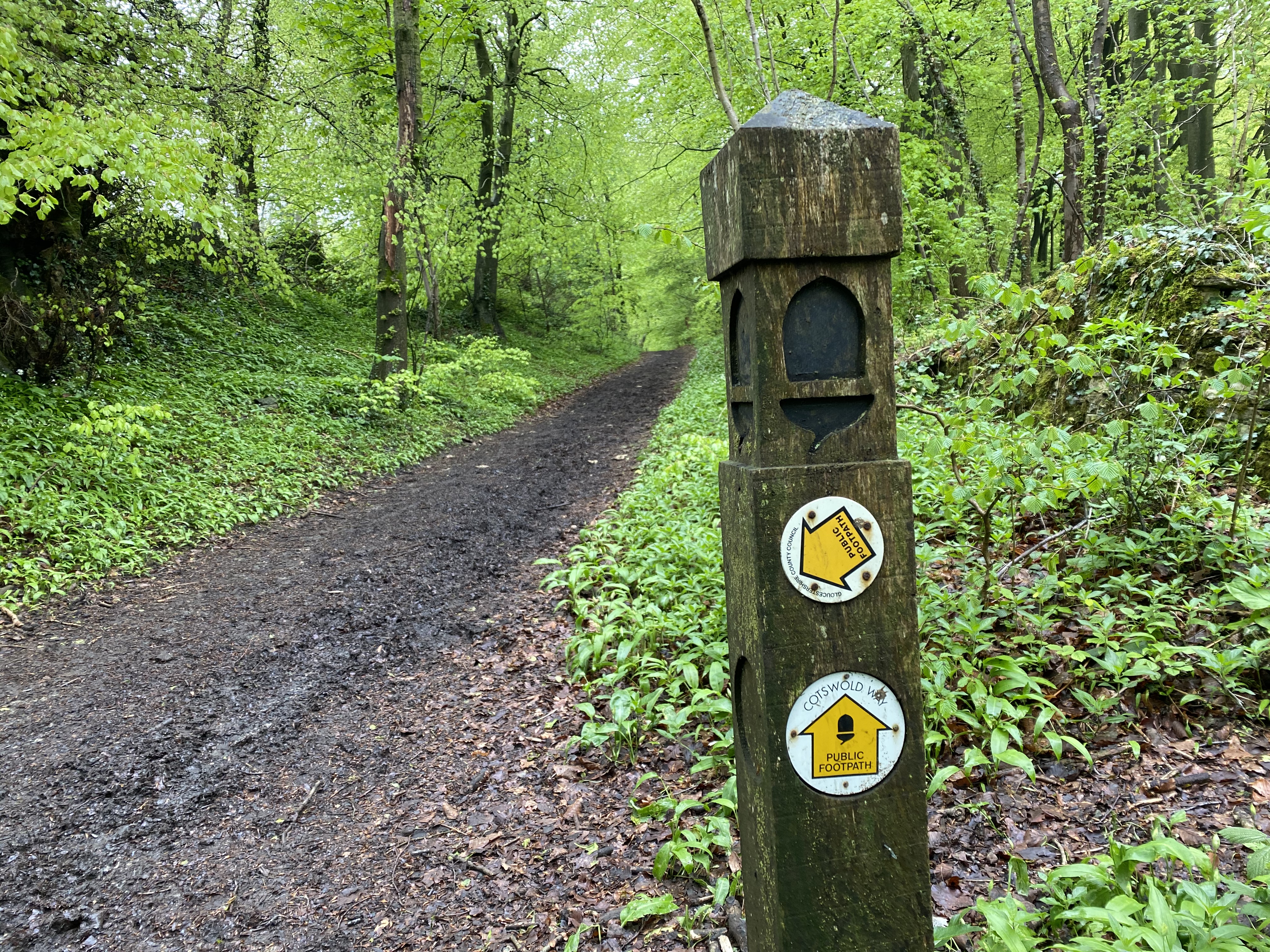 After crossing another road, around Edge, the signs vanished… truly vanished… so I wondered a little, crossed another road on the other side of Rudge Hill and tracked through unchartered woodland to find a welcome faded Cotswold Trail sign at the bottom of a steep descent…