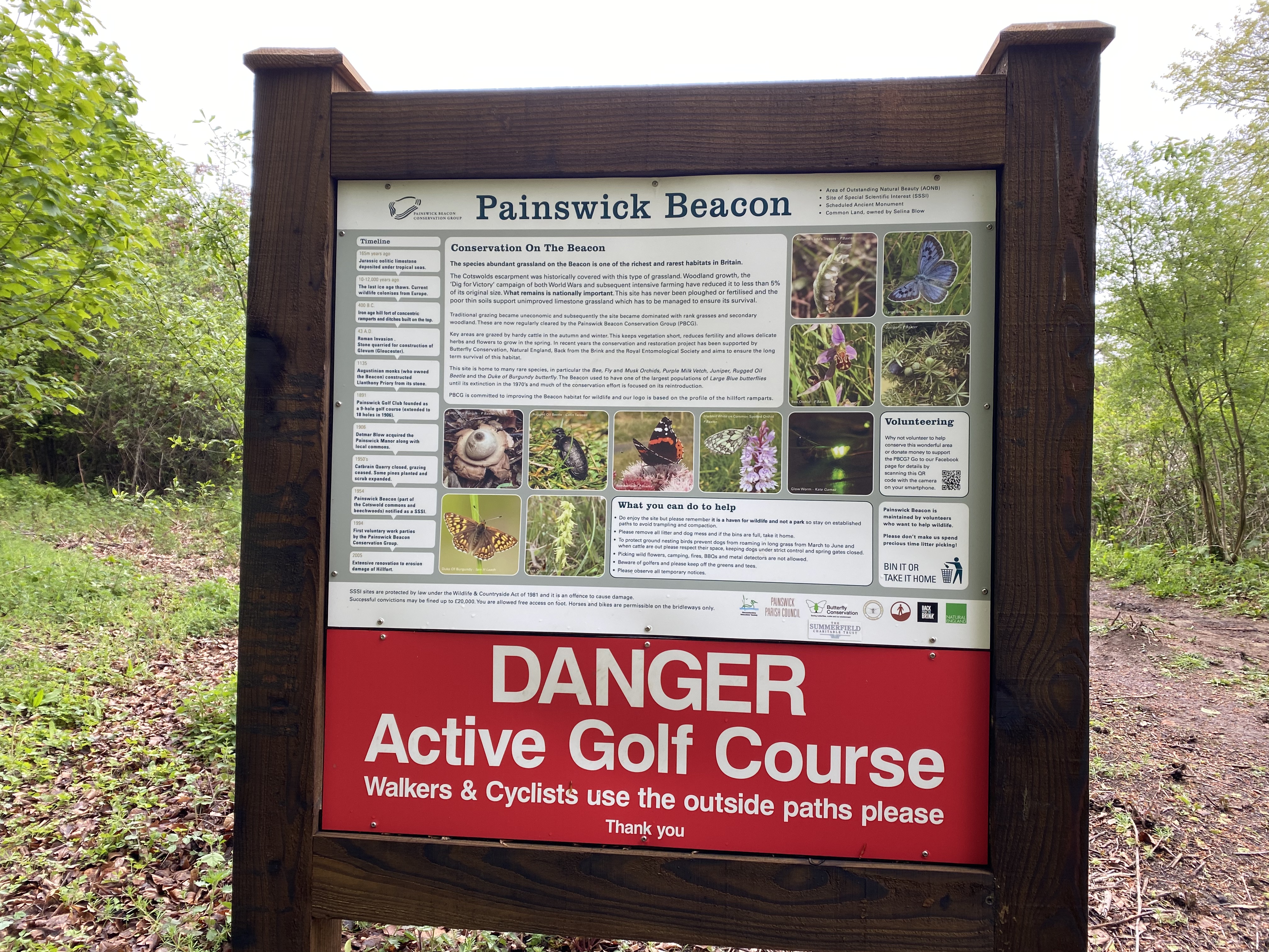 At the end of the woods, you cross the A46 and continue on another stretch, called Pope Wood, and eventually arrive at Painswick Beacon, where the vista opens up. You’re walking along/across/through the Painswick Golf Club so mind your head! Beautiful views from the top of the beacon if you fancy a de-tour. The guide hilariously calls it a peak… ahem 287m? It is hardly a peak… but we take what we’re given, right? It is also called Castle Godwyn because in 1052 was used as a temporary camp by Earl Godwyn. It was very cloudy on Friday, so I didn’t bother. I used to come here a lot many, many years ago, to sit in the sun with a book on the weekends… brought back memories. (Mainly of my ancient metallic-pea-green Volvo, my first car that barely made it up here…)