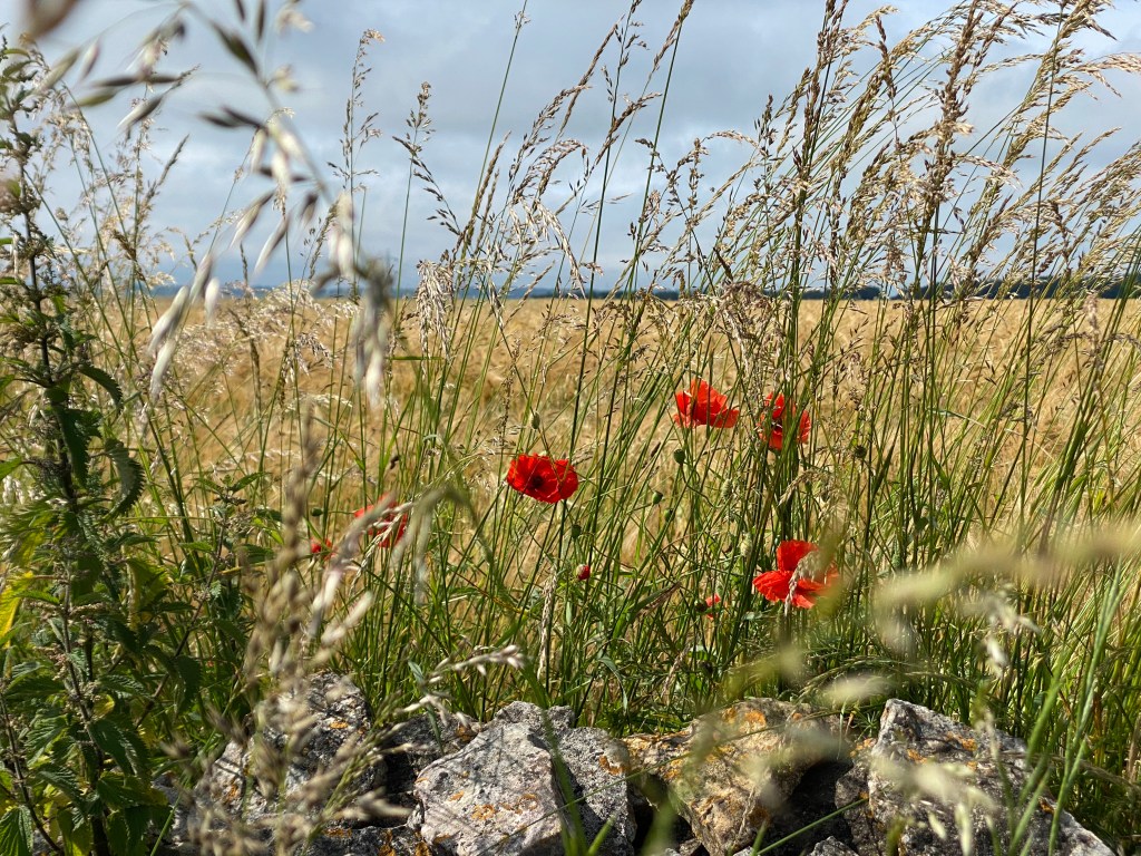 Old paths are dressed in new clothes. Bright red poppies against golden wheat are so intrinsically summer… that I forget I was bored of this walk I could have done it with my eyes closed, stiles and gates included.