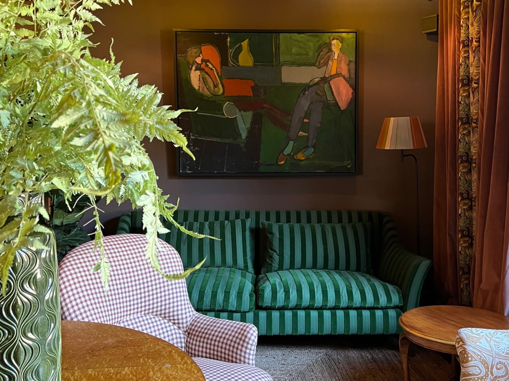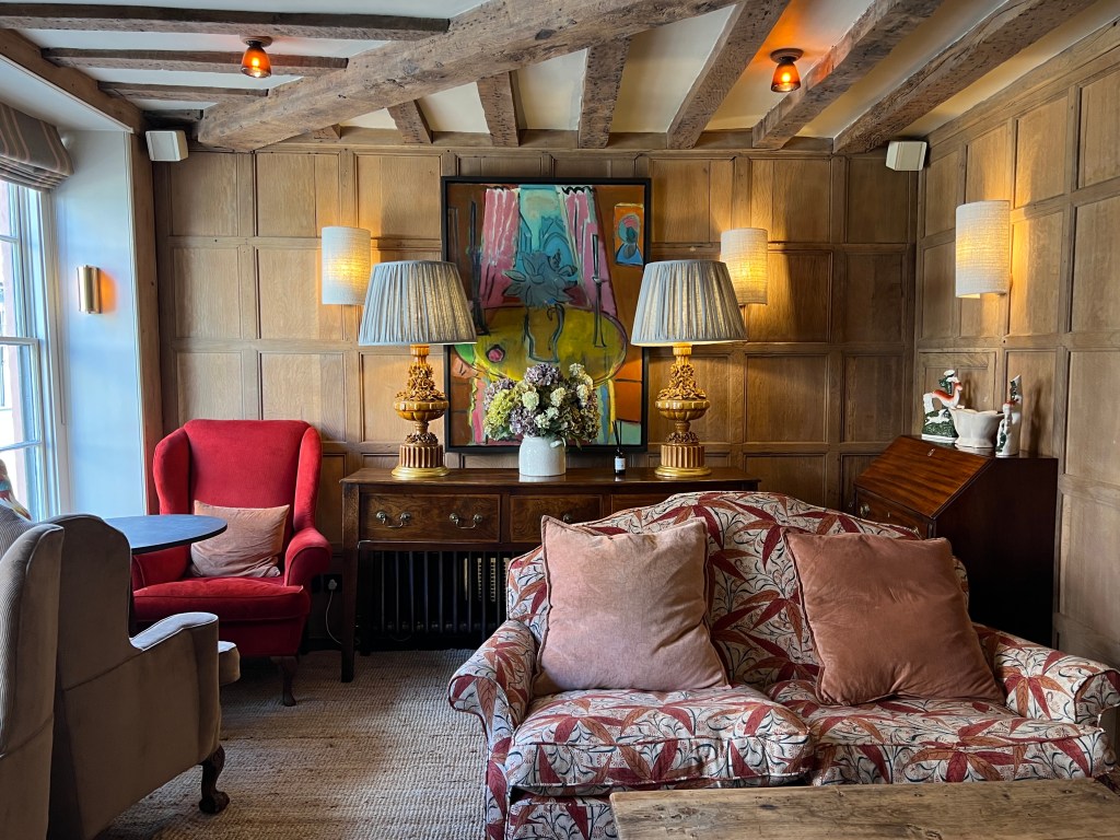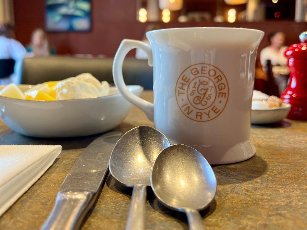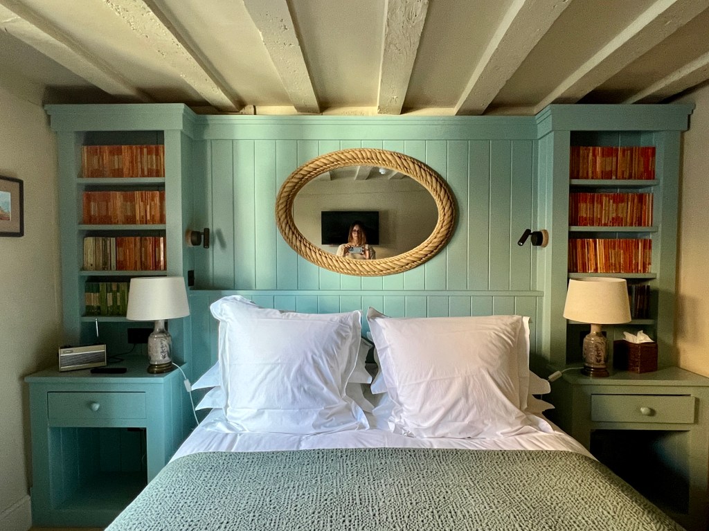 My room at the George Hotel in Rye is bijou but pretty perfect. The furniture is painted in a soothing blue, the bed is high and comfortable and the shelves are full of vintage, orange Penguin novels. There is also a comfortable bath which was an unexpected, joyful surprise. Nothing beats a soak before bed! The building is on a corner of the Main Street, my window (beautiful curtains) faces a tiny side street, and I can see a menswear shop and in its window there are the most garish men shirts I’ve laid my eyes on. It is a strangely reassuring sight in a kind of old fashion way, a modern shop wouldn’t have jarred.
