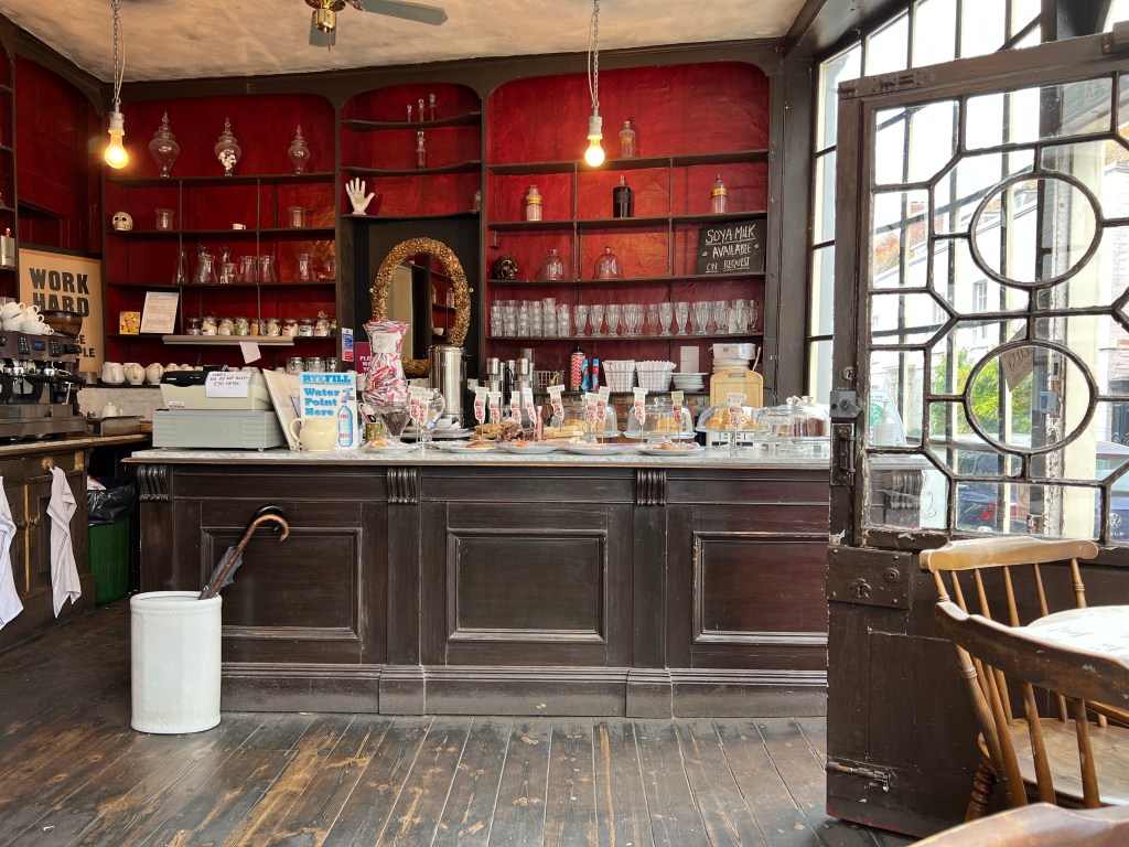 I get directed for lunch to a local cafe called The Apocathery, and old… yes, you guessed it, pharmacy, where I sit with Henry James and a delicious toasted brie sandwich. There are cakes tempting me, but I’m strong.