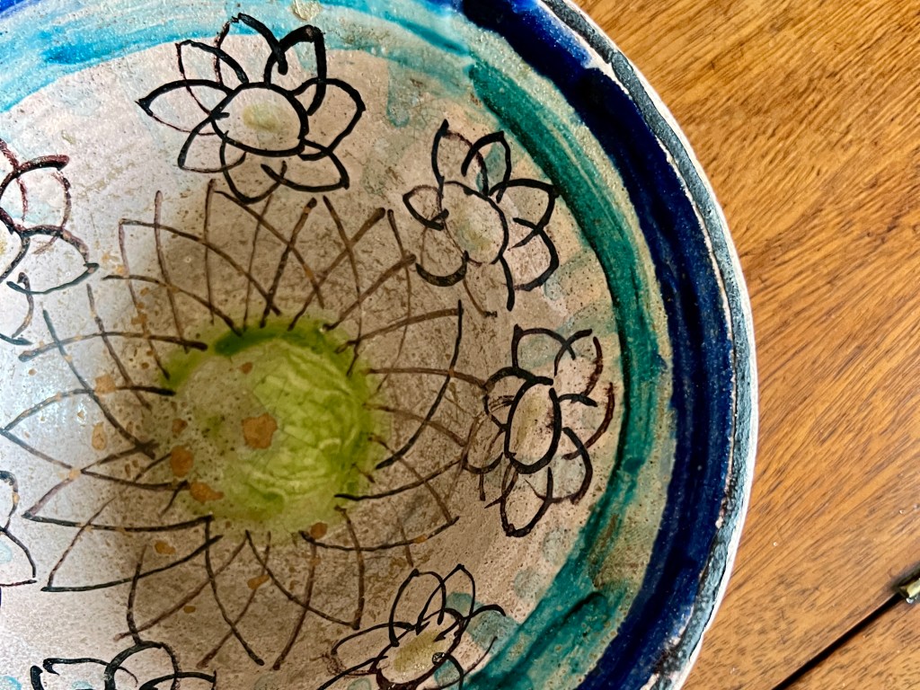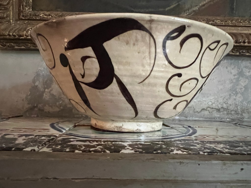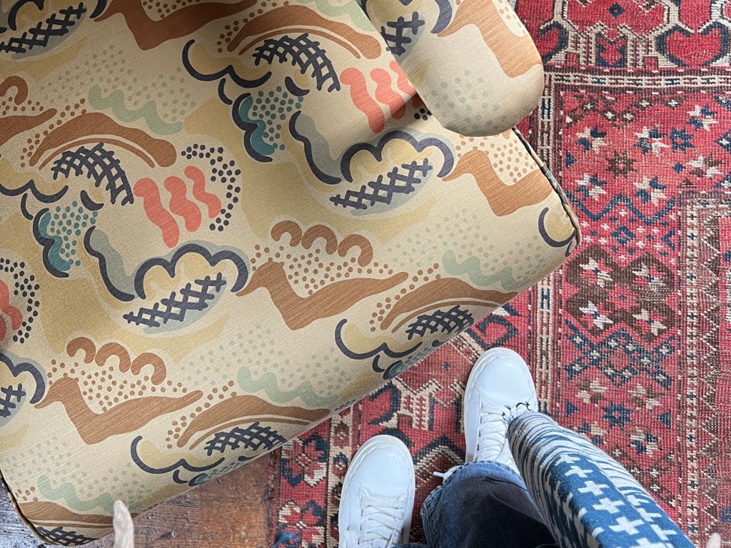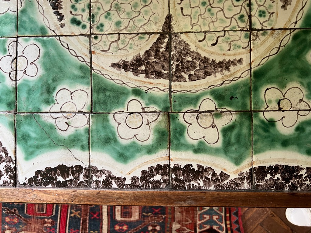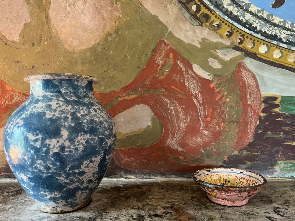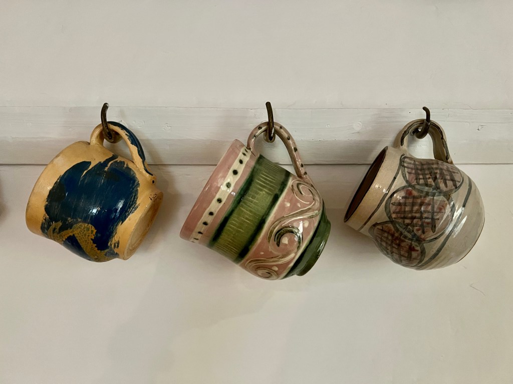 The tour begin in the kitchen… and immediately I am surrounded by traces of these extraordinary people. Fabric designed by Vanessa, handprinted tiles and mugs (her son, Quentin, was a potter)