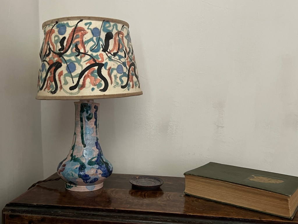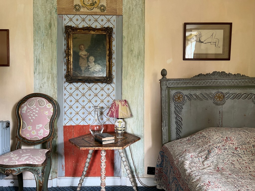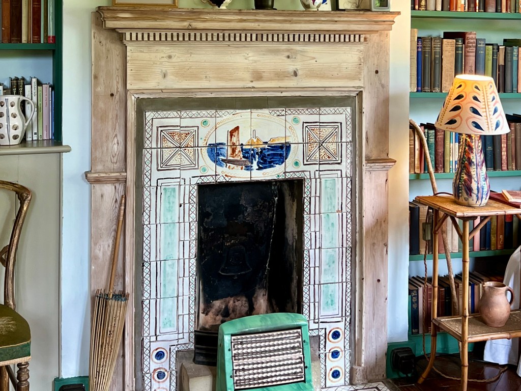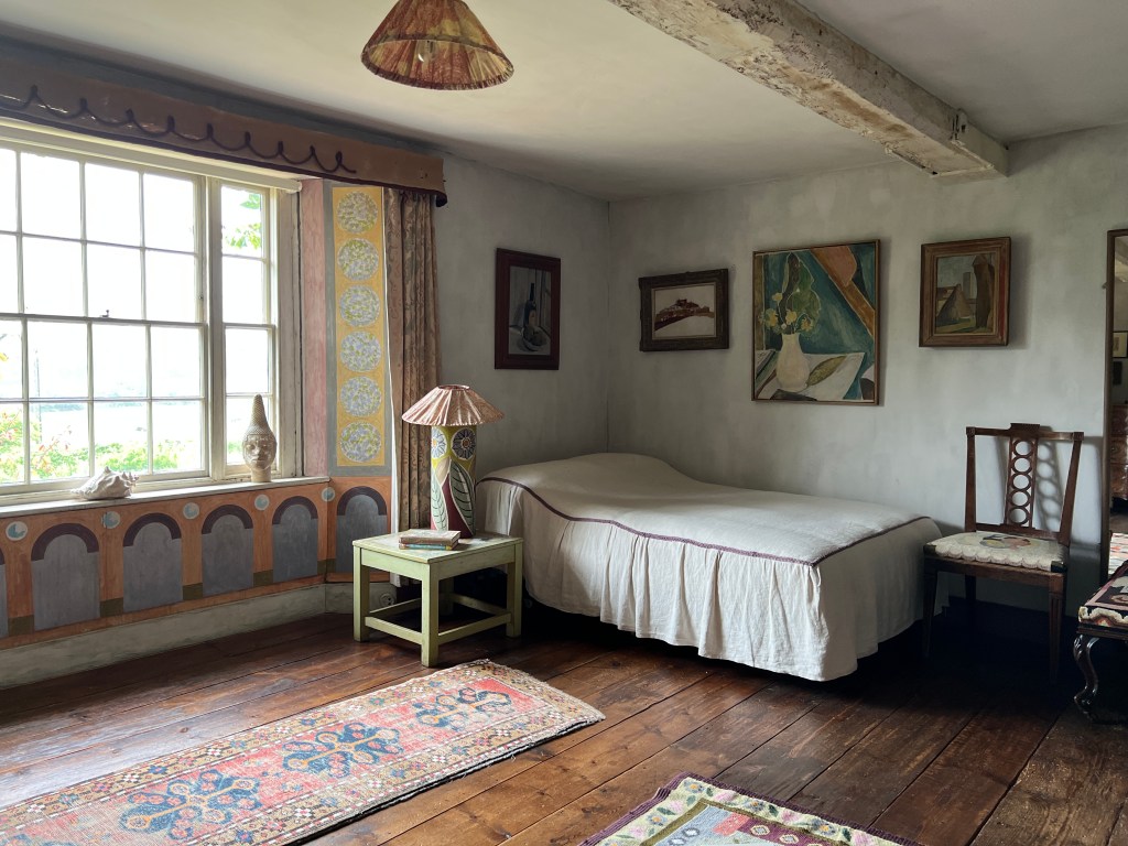 Her sister Vanessa painted the firework tiles and the bedside table lamp, Duncan Grant’s fabric is used for the curtains.