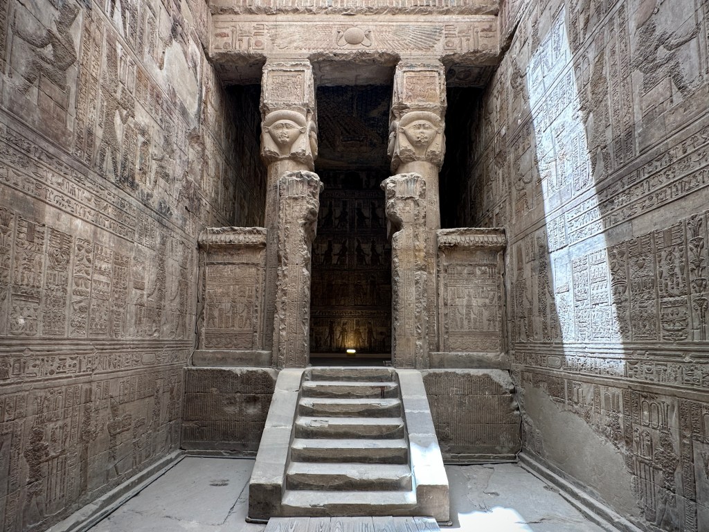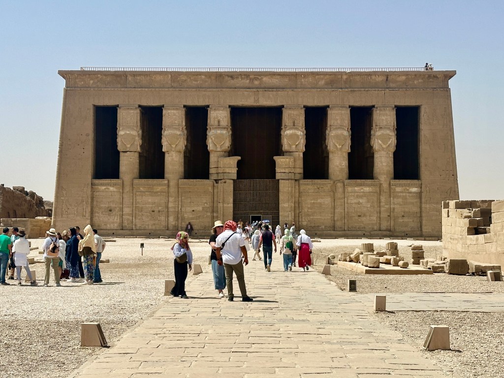It was built 4000 years ago to honour the goddess Athor, who was goddess of many things: love, beauty, music, dancing, fertility, and pleasure. She was the protector of women, though men also worshipped her. She had both priests as well as priestesses in her temples. It was built primarily during the Ptolemaic Dynasty, which was a period of Greek rule in Egypt. However, construction of the temple was completed under the Roman emperor Trajan, who is seen depicted on the walls of the complex making offerings to Hathor. The temple complex also includes a monumental gateway, constructed by Trajan as well as Domitian, another Roman emperor.
